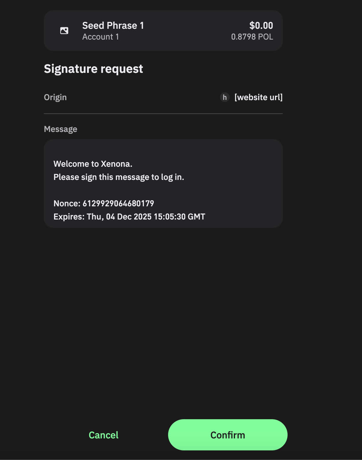 Signing it confirms that you are the real owner of the connected wallet and lets Xenona authenticate your session. This is the Web3 version of “logging in.”