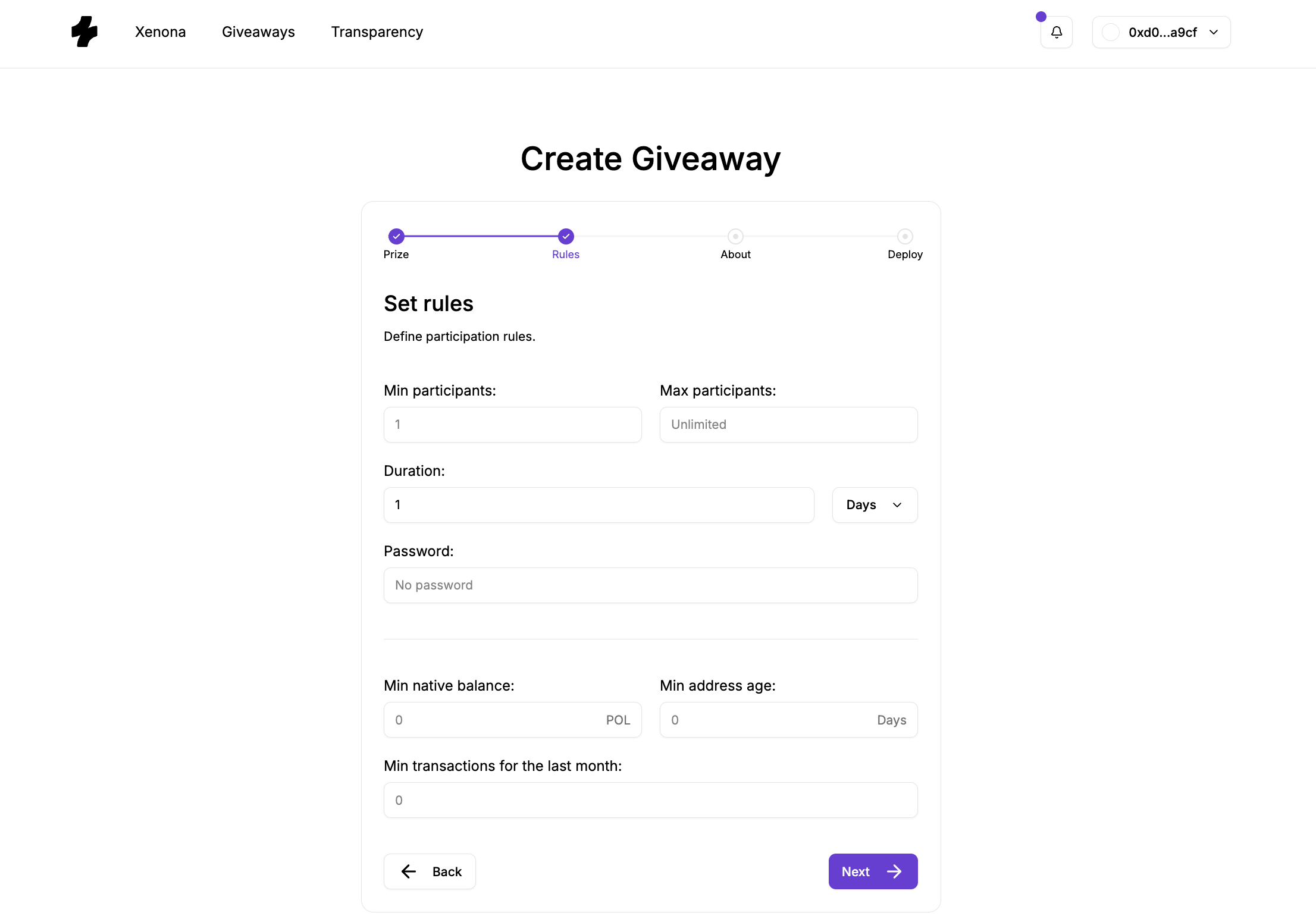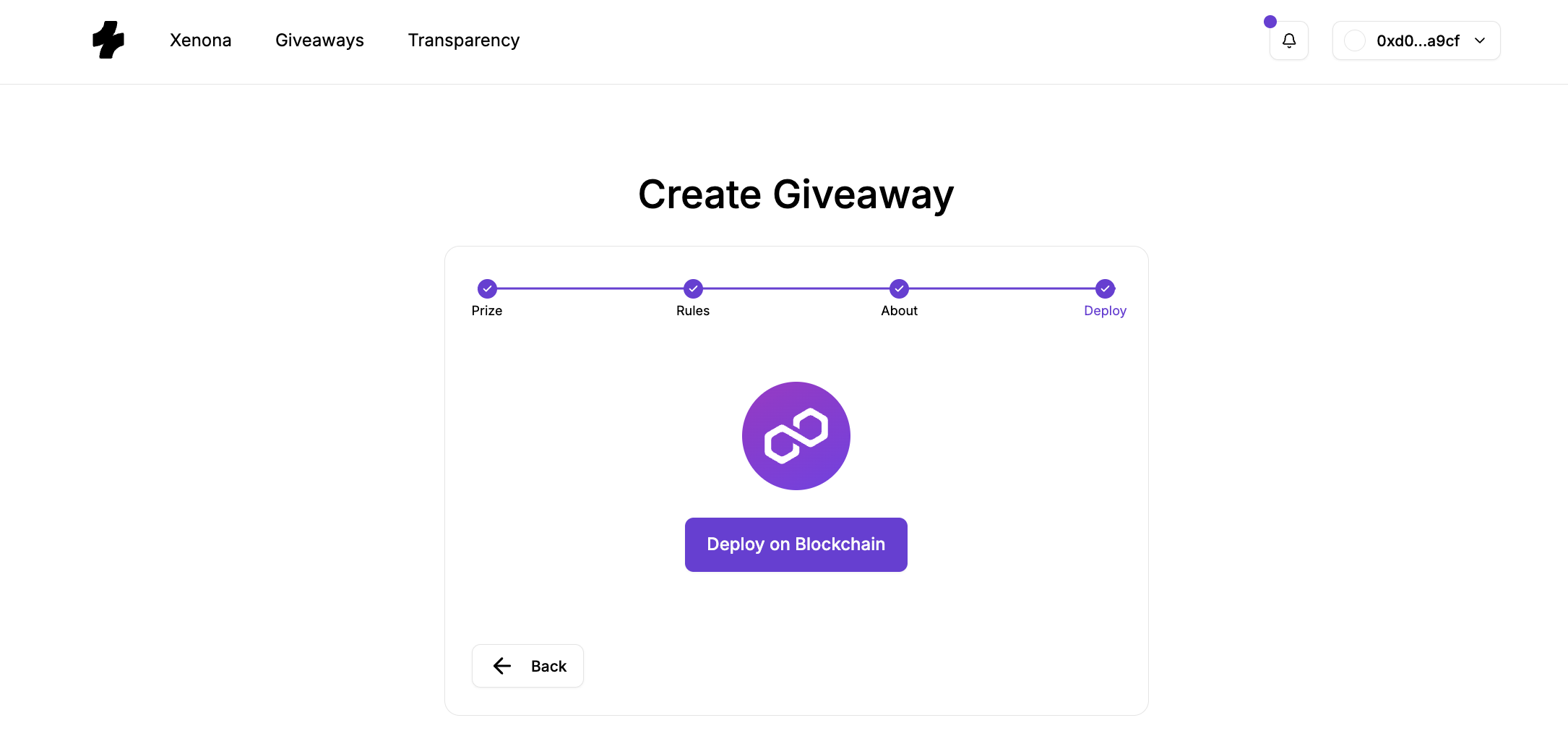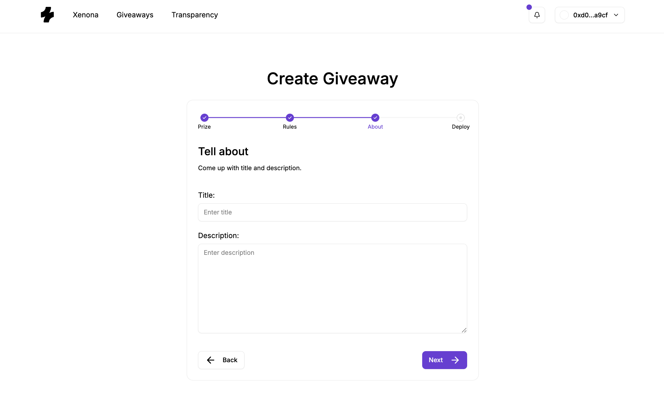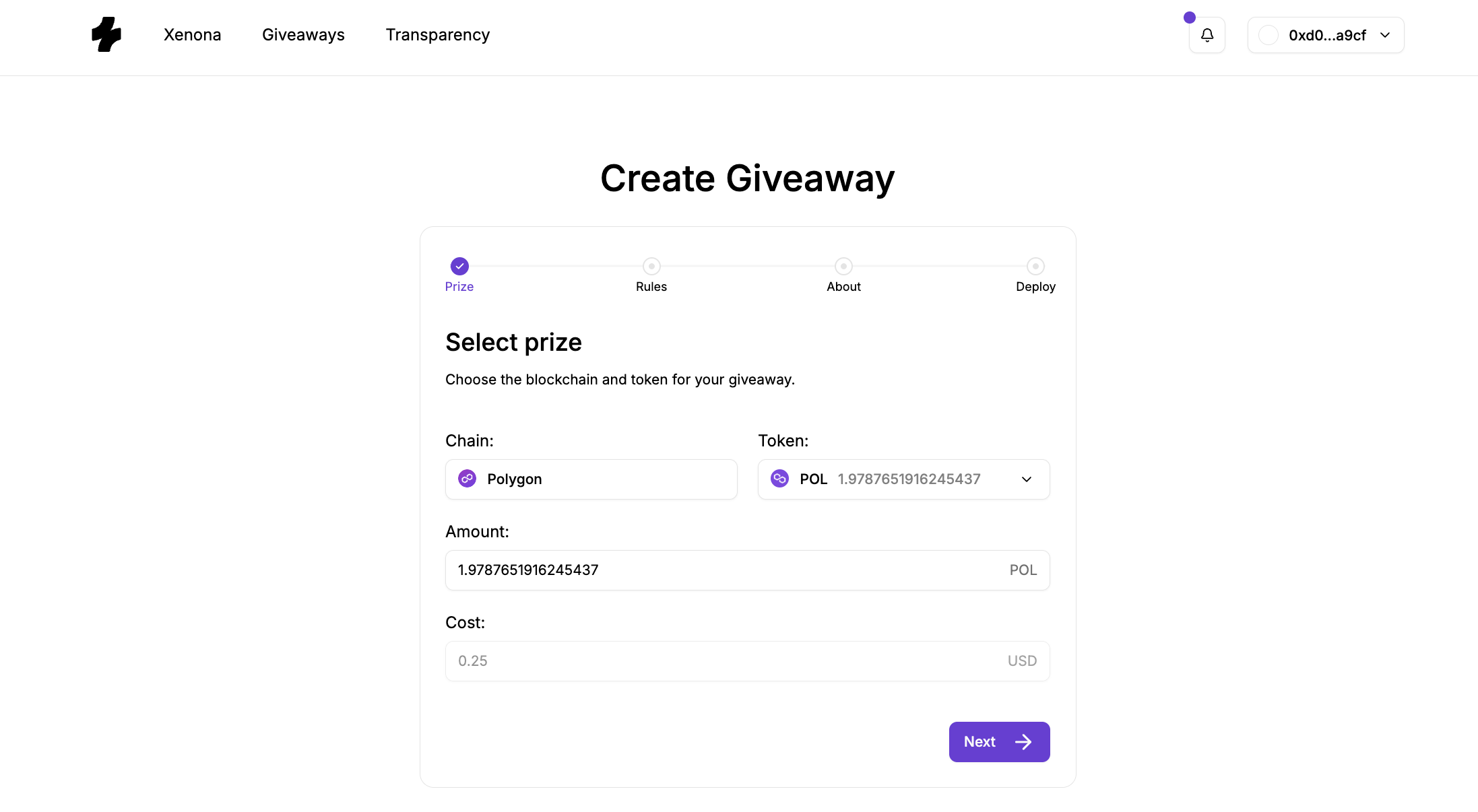 Creating a giveaway on Xenona is designed to be simple, structured, and fully on-chain. The platform walks you through a clear step-by-step flow where you configure your prize, rules, and presentation — and then deploy the giveaway as an autonomous smart contract.